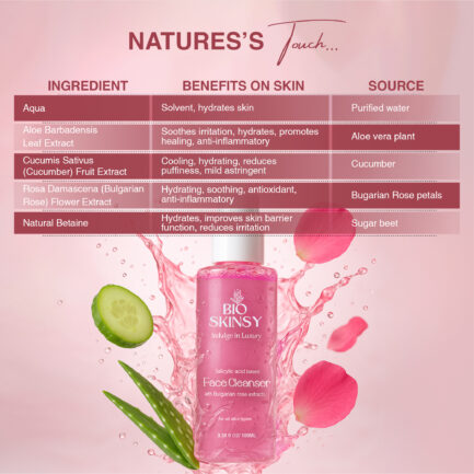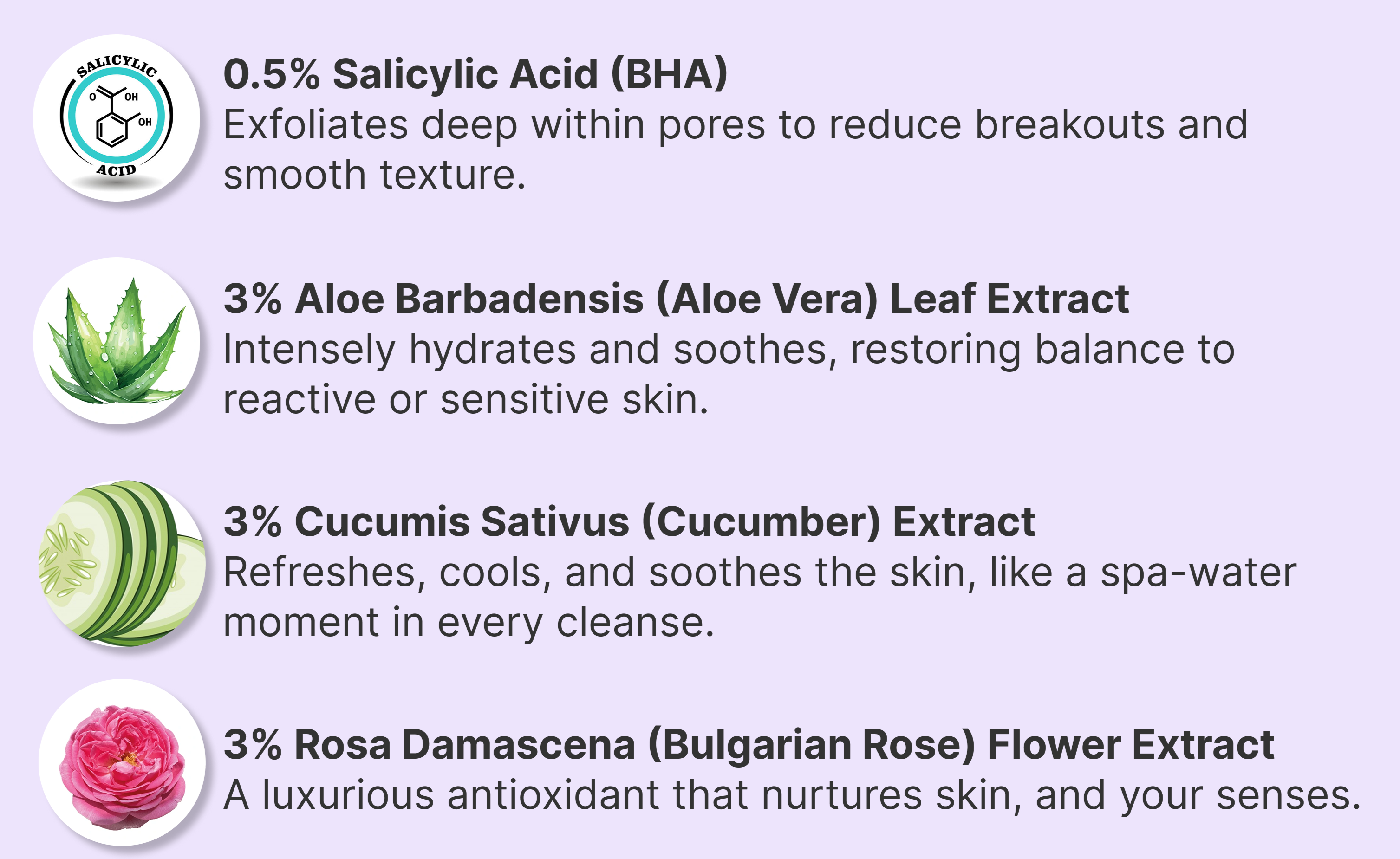 The hydrating power of aloe and cucumber extracts, paired with antioxidant-rich and luxurious Bulgarian rose extract, balances the effects of salicylic acid to purify without disturbing your skin’s natural harmony.