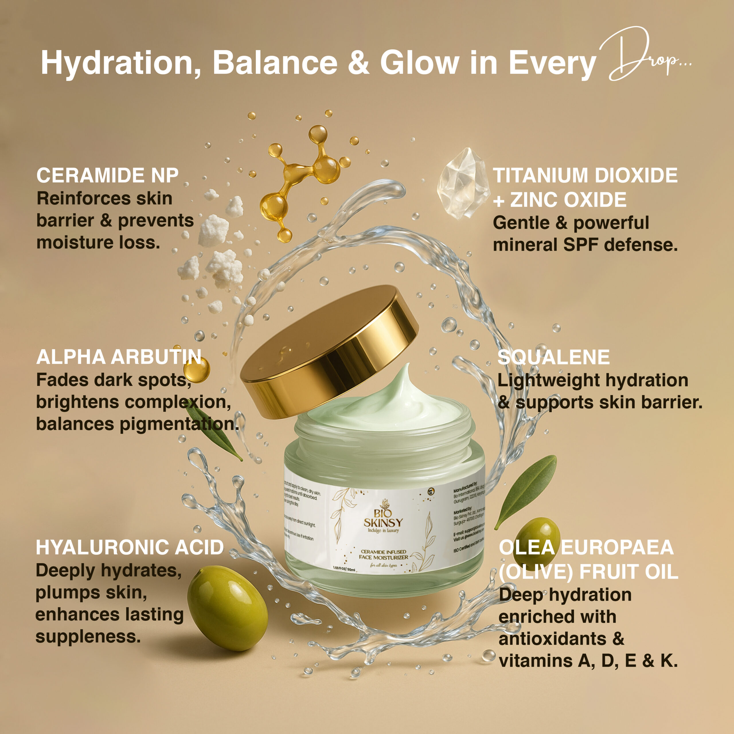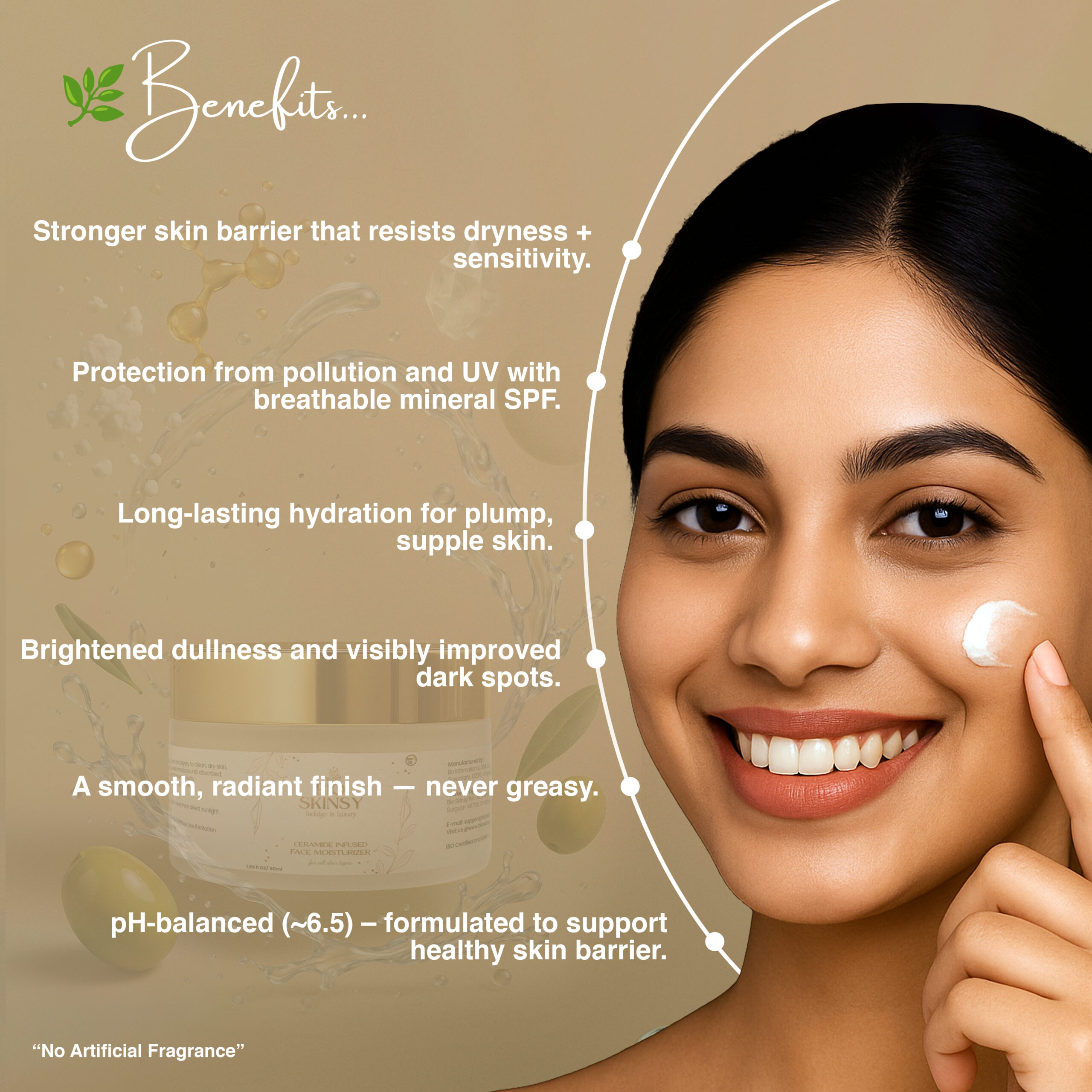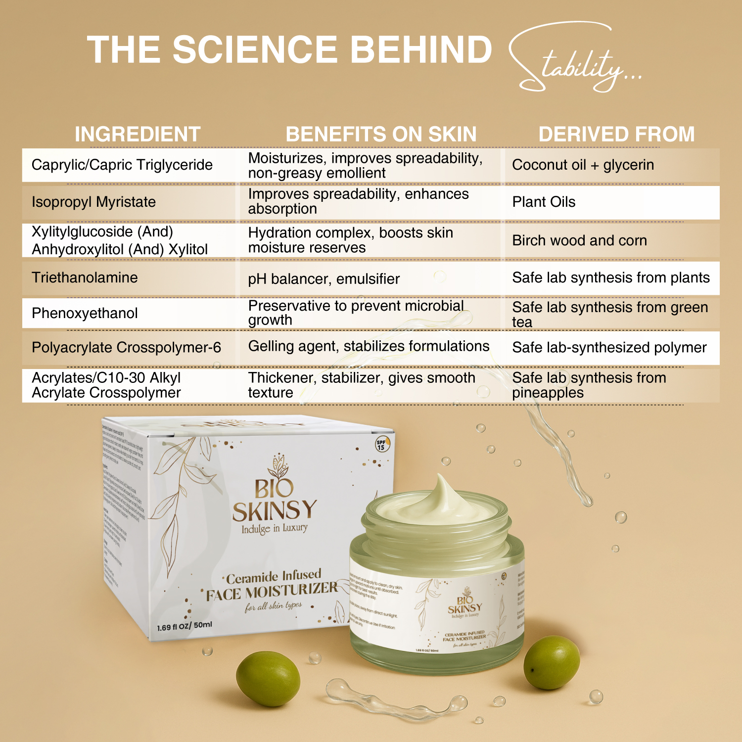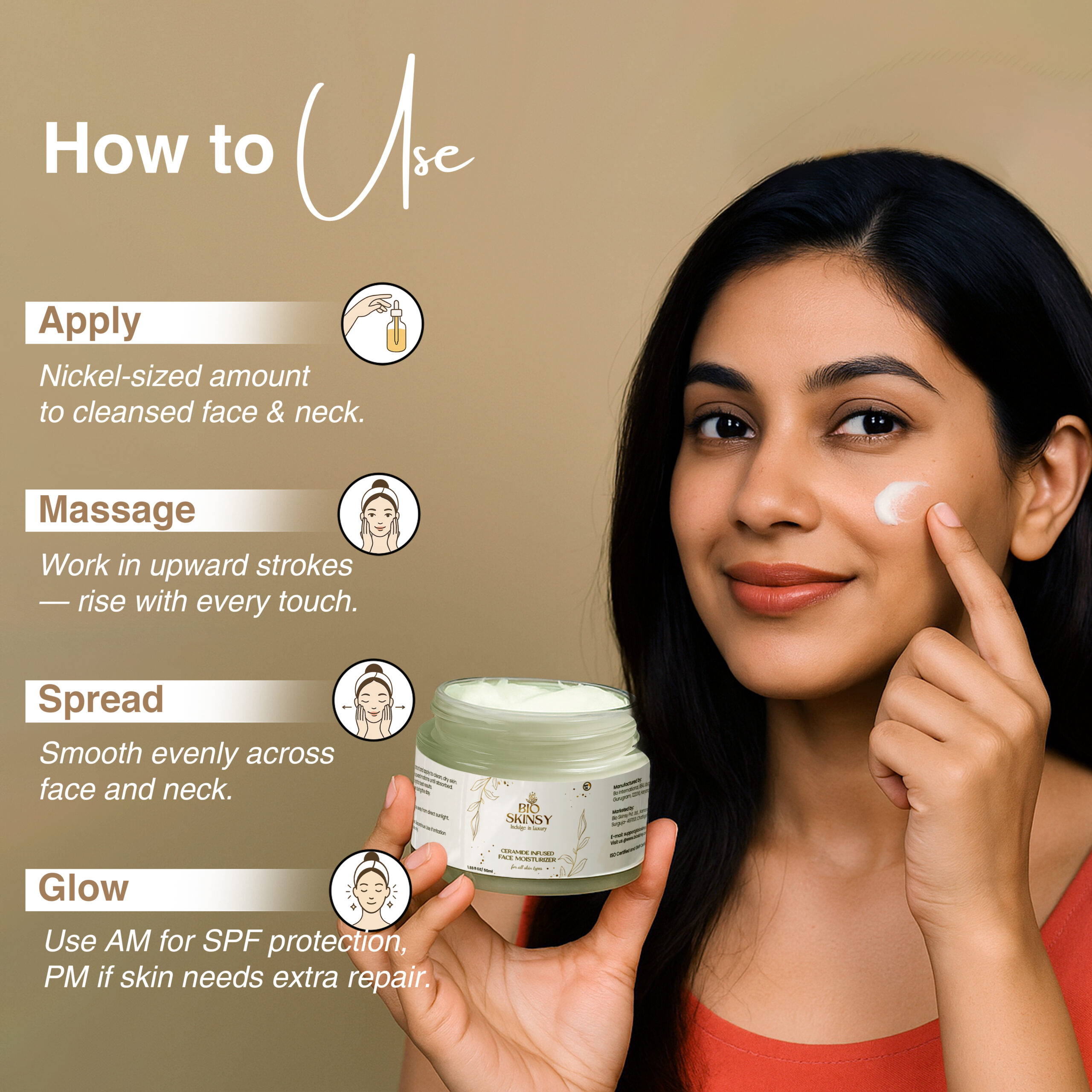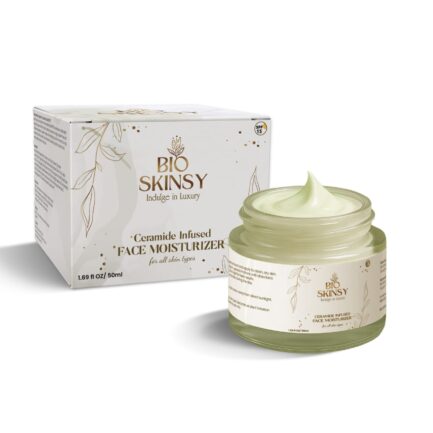 The Bio Skinsy™ Daily Defense Face Moisturizer rebuilds your skin barrier with Ceramides, Squalene, and Sweet Almond Oil.