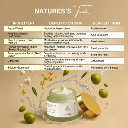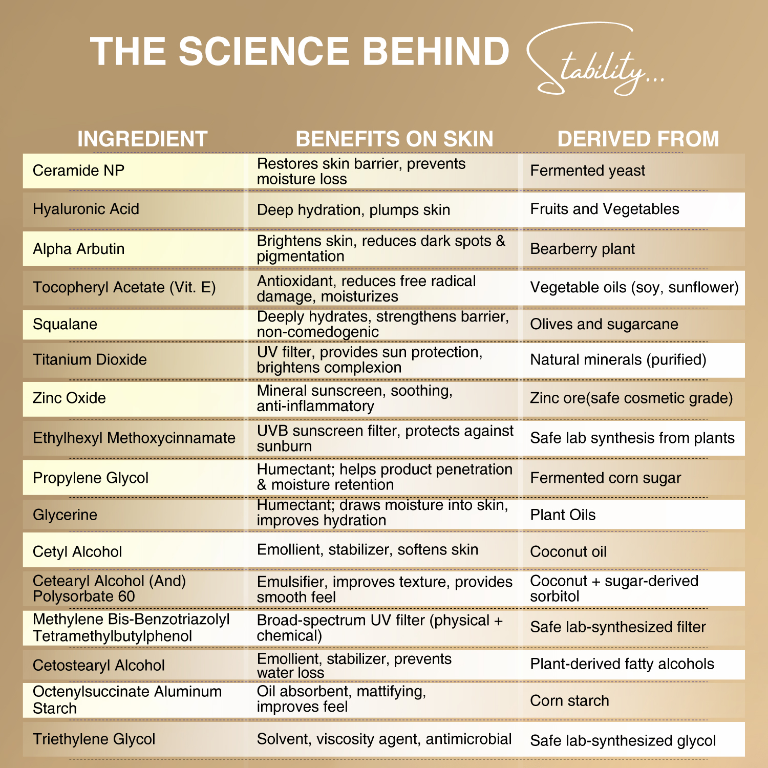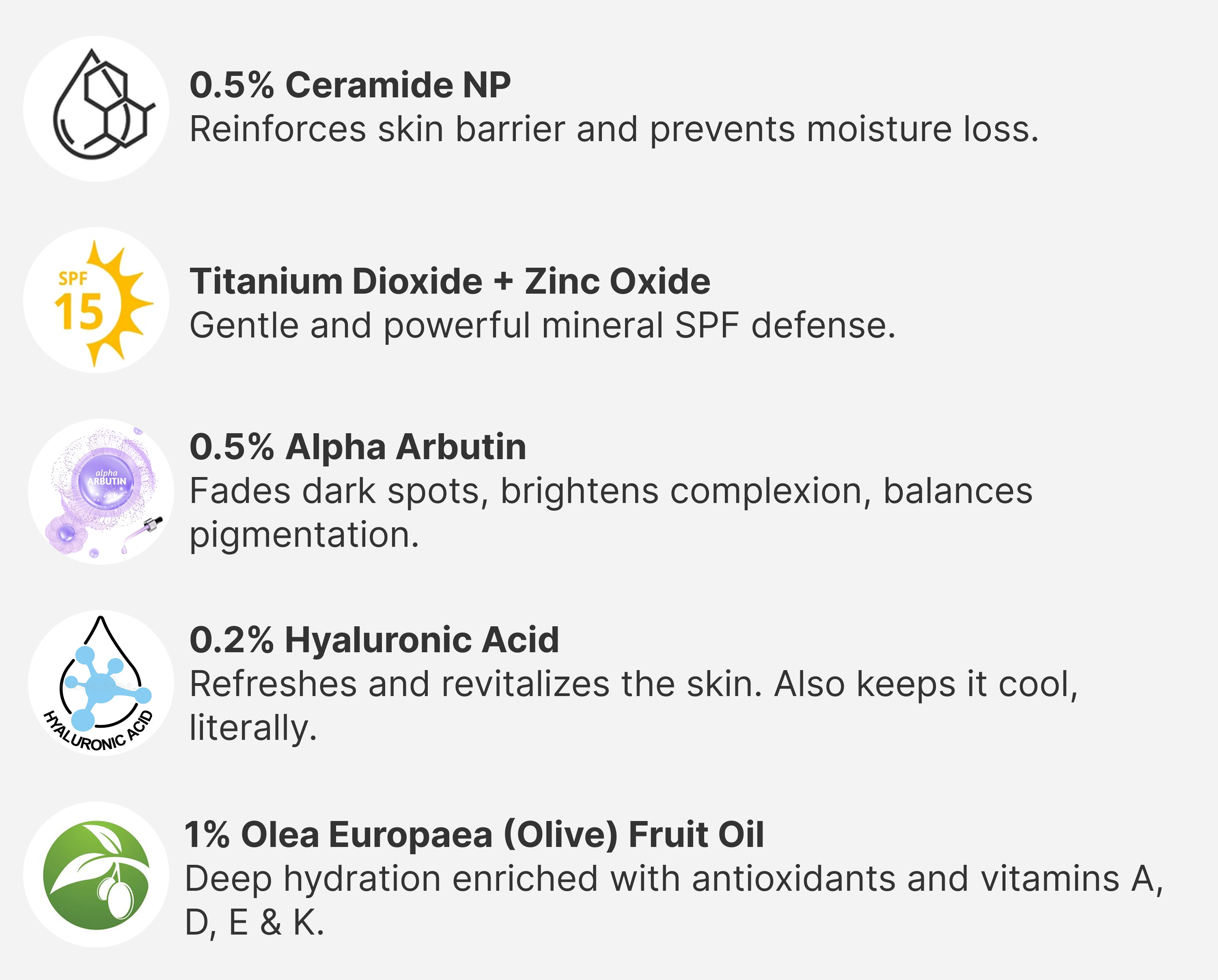 CERAMIDE NP-0.5%, ALPHA ARBUTIN-0.5%, HYALURONIC ACID-0.2%, SQUALANE, OLEA EUROPAEA (OLIVE) FRUIT OIL-1%, PRUNUS AMYGDALUS DULCIS (SWEET ALMOND) OIL-1%, AQUA, ALOE BARBADENSIS LEAF EXTRACT-2%, BUTYROSPERMUM PARKII (SHEA) BUTTER-1%, TITANIUM DIOXIDE, ZINC OXIDE, CITRIC ACID, TOCOPHERYL ACETATE, ETHYLHEXYL METHOXYCINNAMATE, PROPYLENE GLYCOL, GLYCERINE, CETYL ALCOHOL, CETEARYL ALCOHOL (AND) POLYSORBATE 60, METHYLENE BIS BENZOTRIAZOLYL TETRAMETHYLBUTYLPHENOL, CETOSTEARYL ALCOHOL, OCTENYLSUCCINATE, ALUMINUM STARCH, TRIETHYLENE GLYCOL, CAPRYLIC/CAPRIC TRIGLYCERIDE, ISOPROPYL MYRISTATE XYLITYLGLUCOSIDE (AND) ANHYDROXYLITOL (AND) XYLITOL, ACRYLATES/C10-30 ALKYL ACRYLATE CROSSPOLYMER, TRIETHANOLAMINE, PHENOXYETHANOL, SODIUM GLUCONATE, POLYACRYLATE CROSSPOLYMER-6